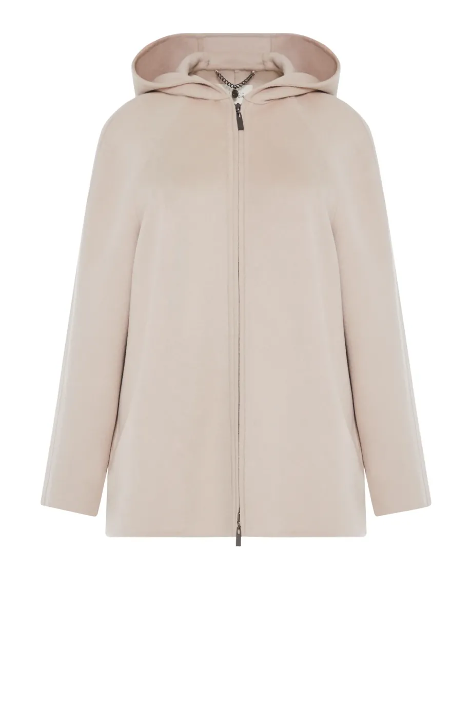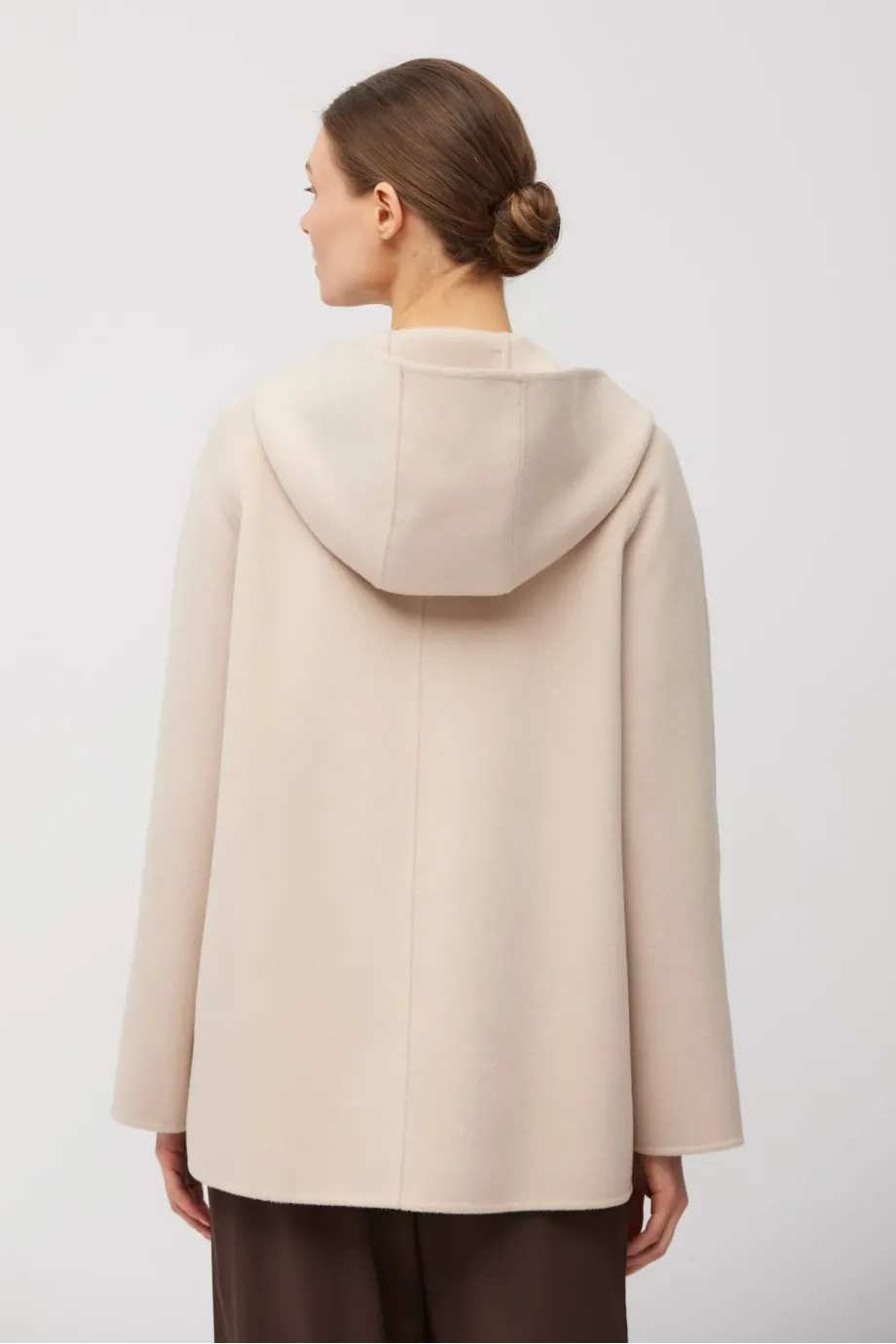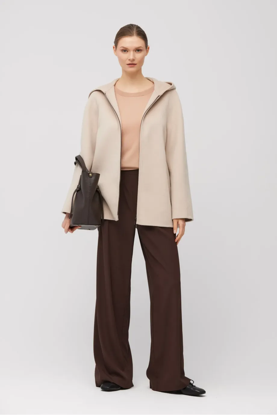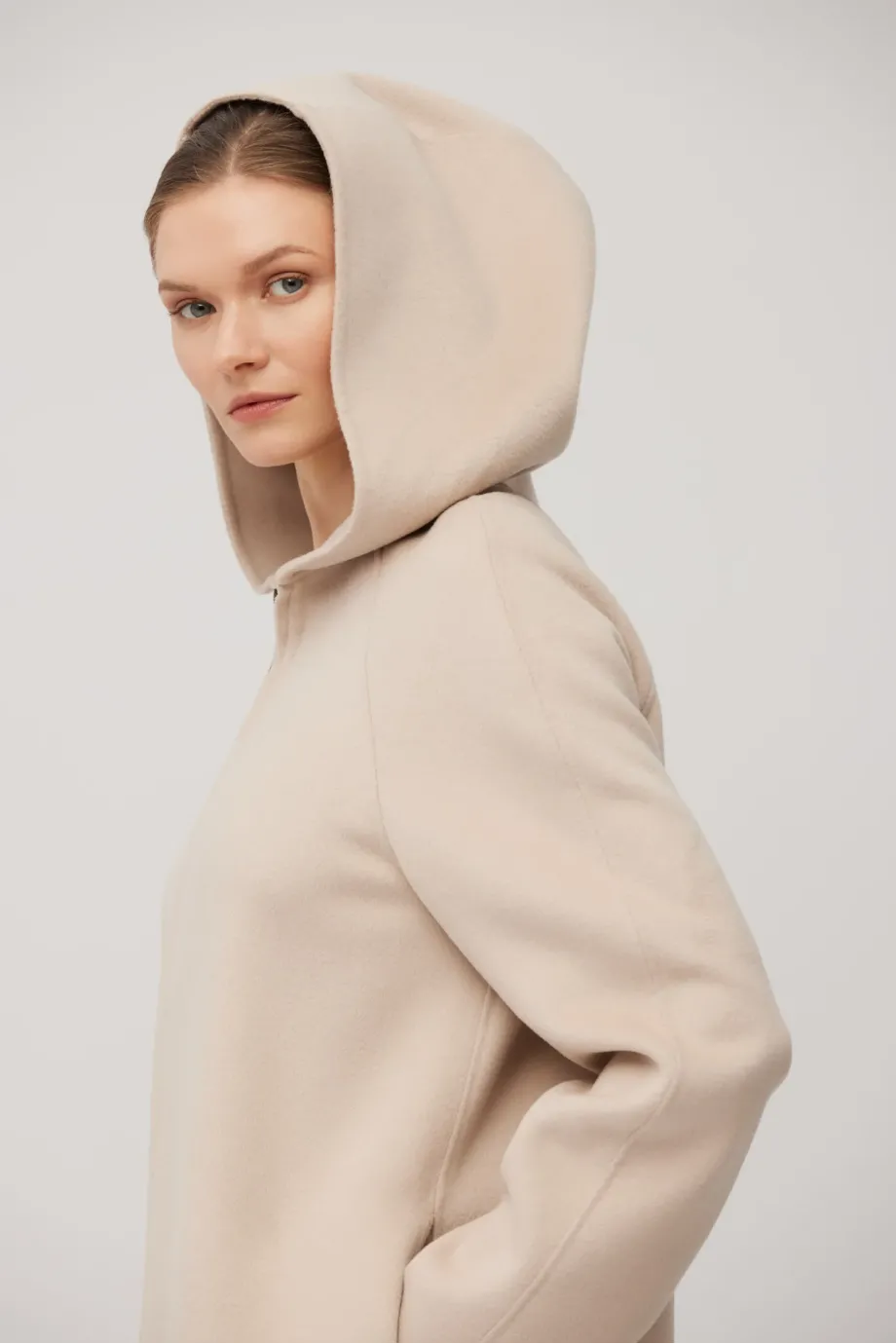 Lekka, niepodszewkowana kurtka o prostej, luźnej formie. Tkanina doubleface – mieszanka wełny i jedwabiu. Model z kapturem i dwubiegunowym metalowym suwakiem. Kolor beżowy.