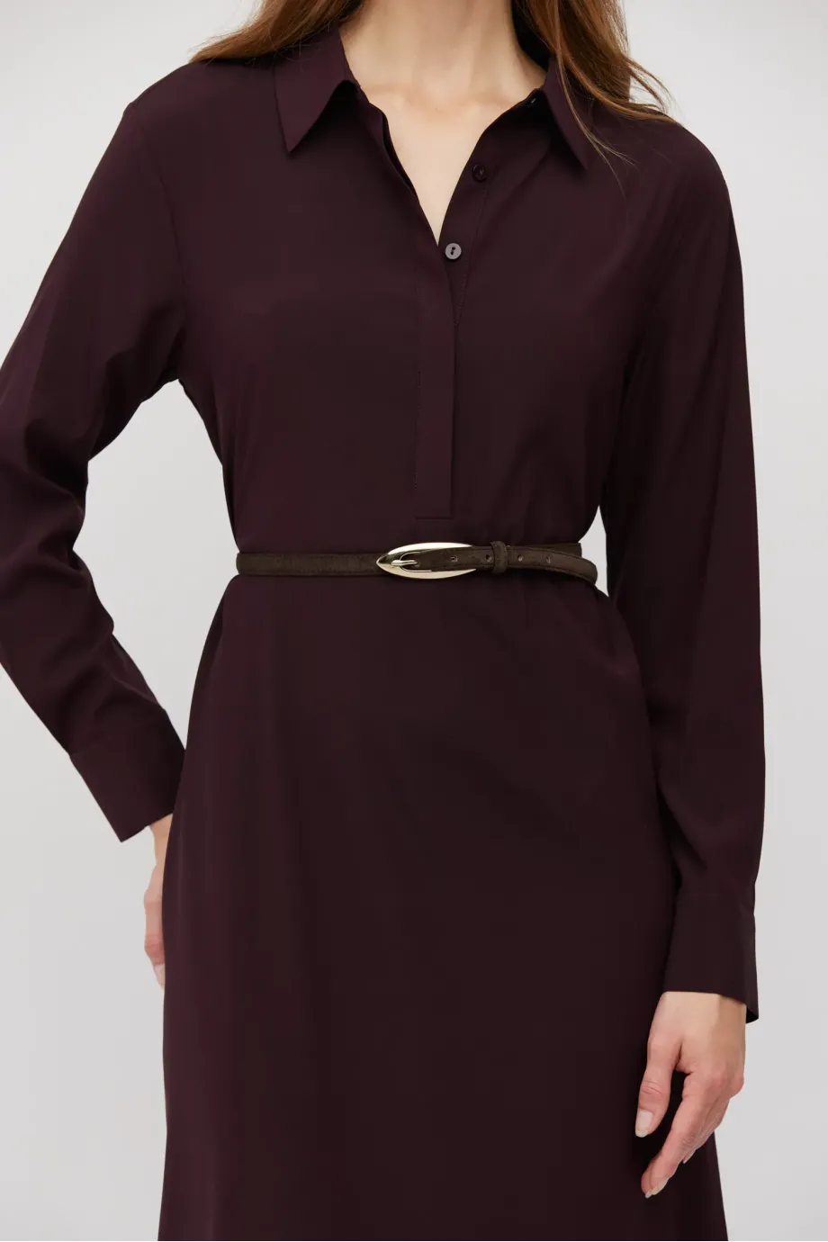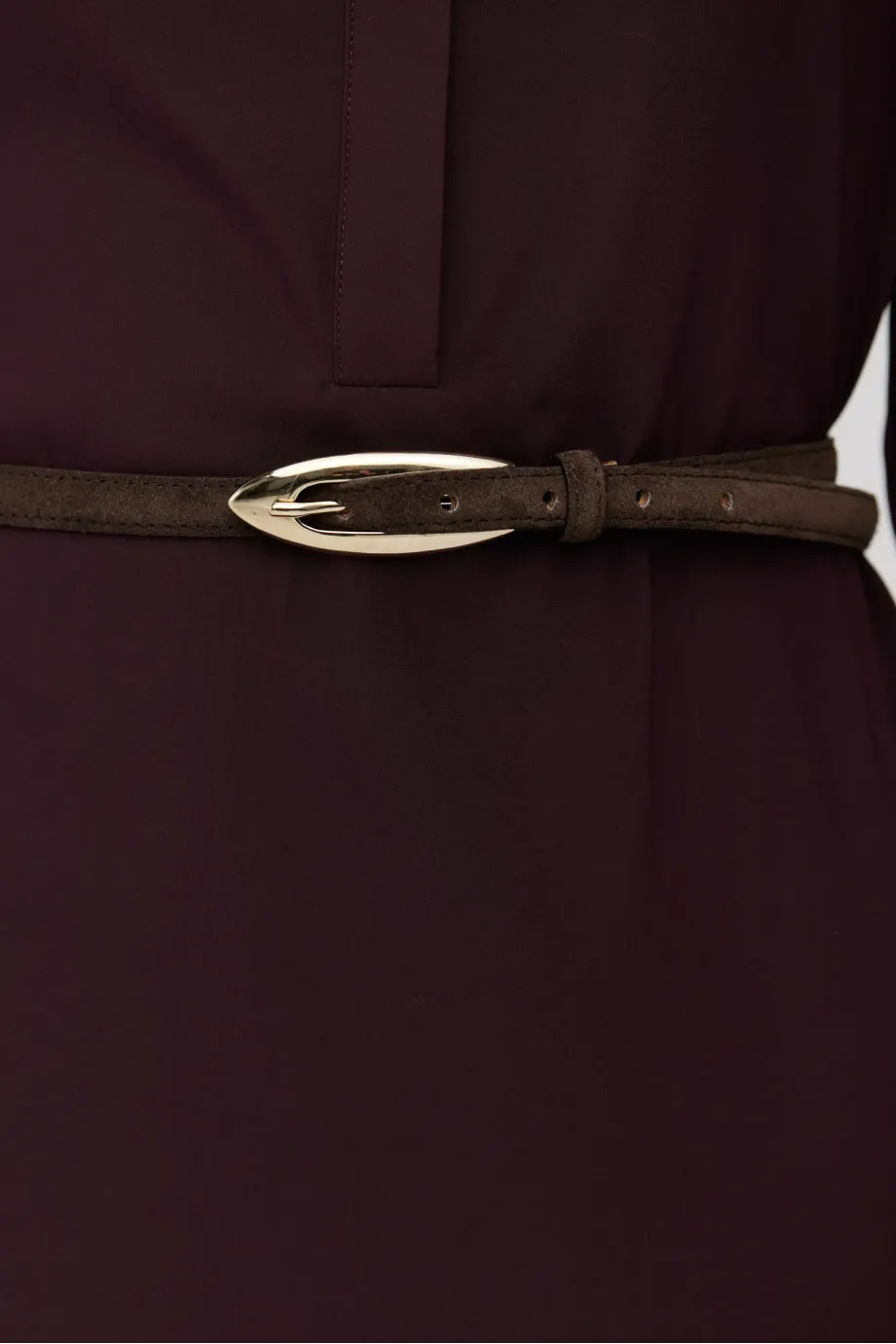 Brązowy, cienki pasek z naturalnej skóry zamszowej, z owalną klamrą w kolorze złota. Ręcznie wykonany w polskiej manufakturze.