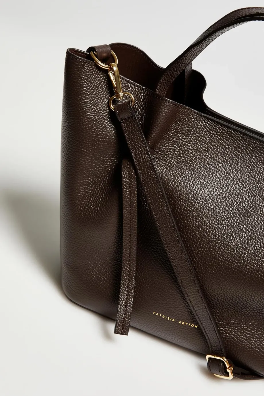 Torba typu shopper wykonana z naturalnej, brązowej skóry groszkowej. Ręcznie uszyta we włoskiej manufakturze. Wnętrze wyposażone w odpinaną saszetkę na suwak. Złote okucia, solidne rączki.