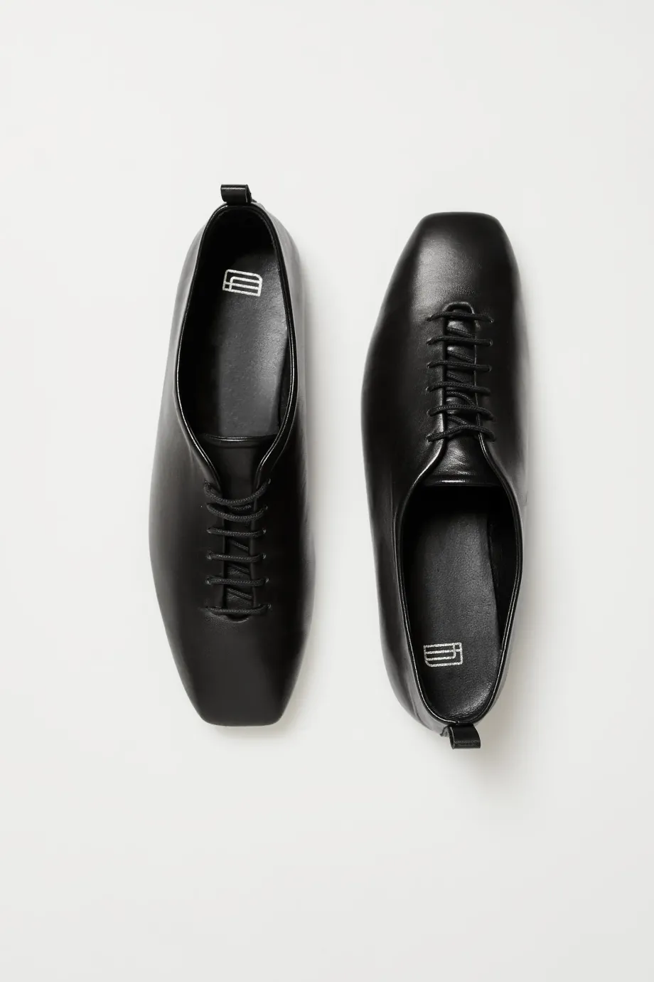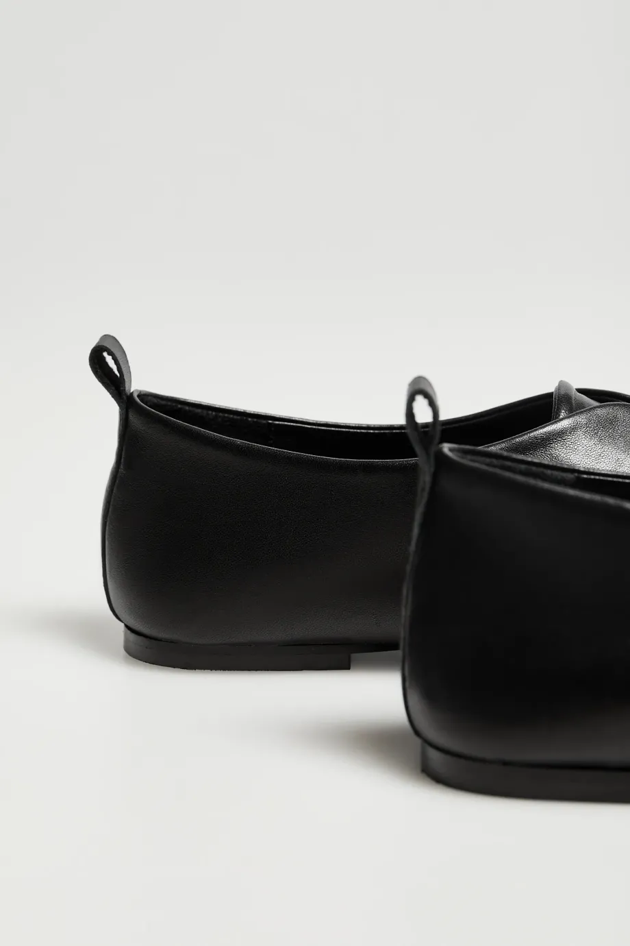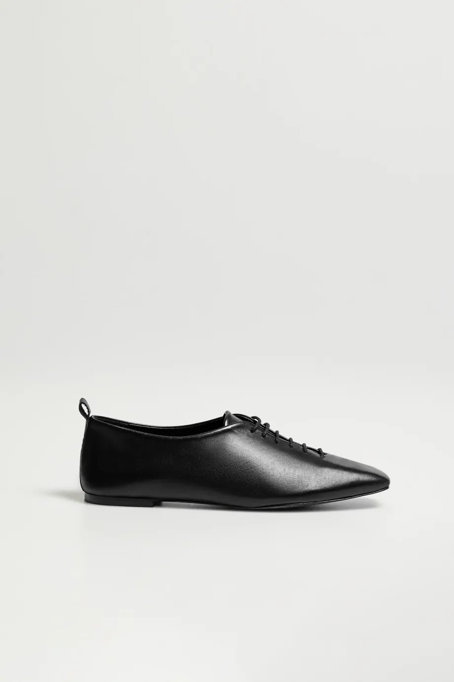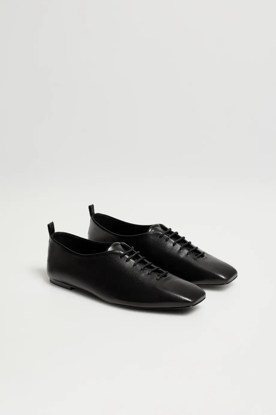 Baleriny wykonane z miękkiej skóry licowej. Niska cholewka z pełnym sznurowaniem. Migdałowy, lekko wydłużony nosek. Skórzana wyściółka i wkładka. Cienka, elastyczna podeszwa. Model o lekkiej konstrukcji. Uszyte ręcznie w hiszpańskiej manufakturze.