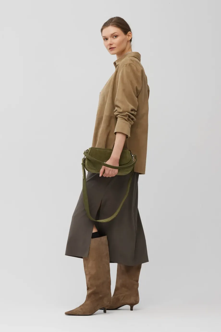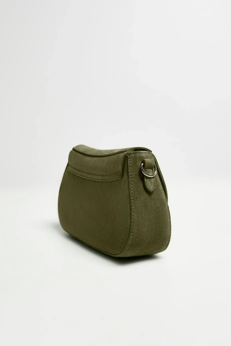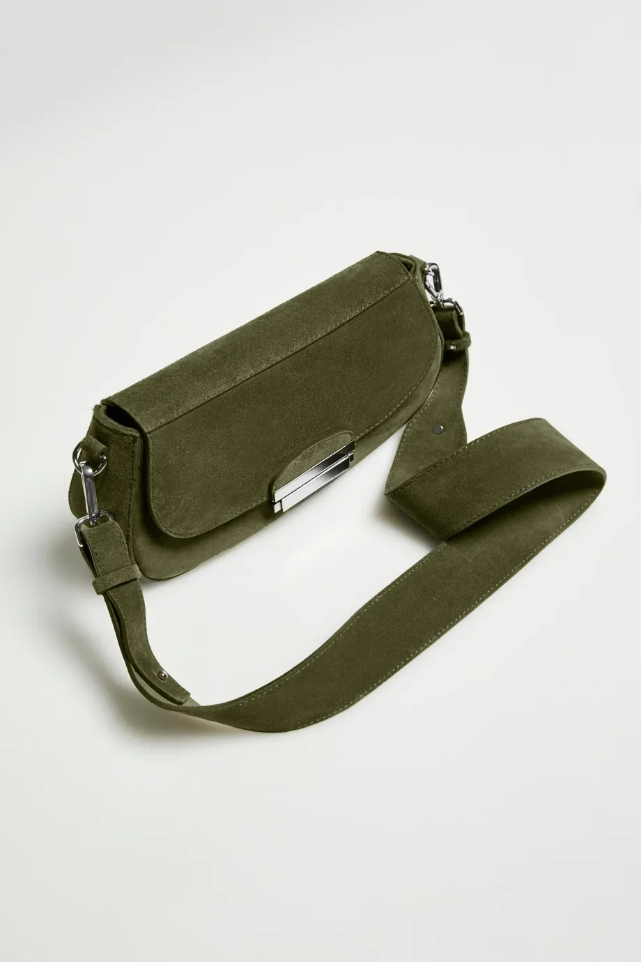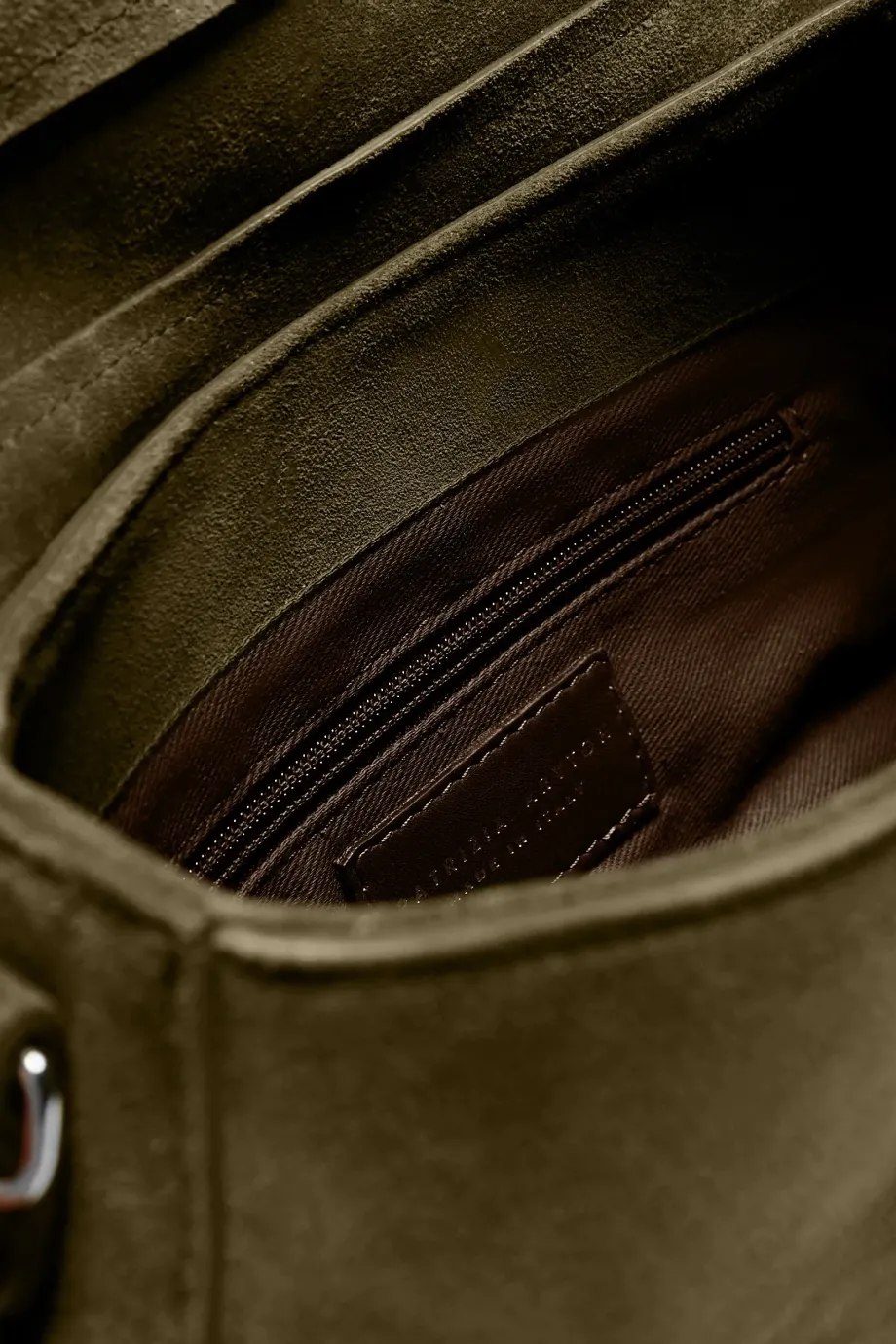 Mała torebka ze skóry zamszowej w kolorze zieleni. Uszyta we Włoszech. Klasyczny kształt z funkcją crossbody - szeroki pasek oraz metalowe okucia w kolorze srebra. Zamykana na klapkę z metalowym zapięciem. Wewnątrz podszewka i mała kieszonka na suwak.