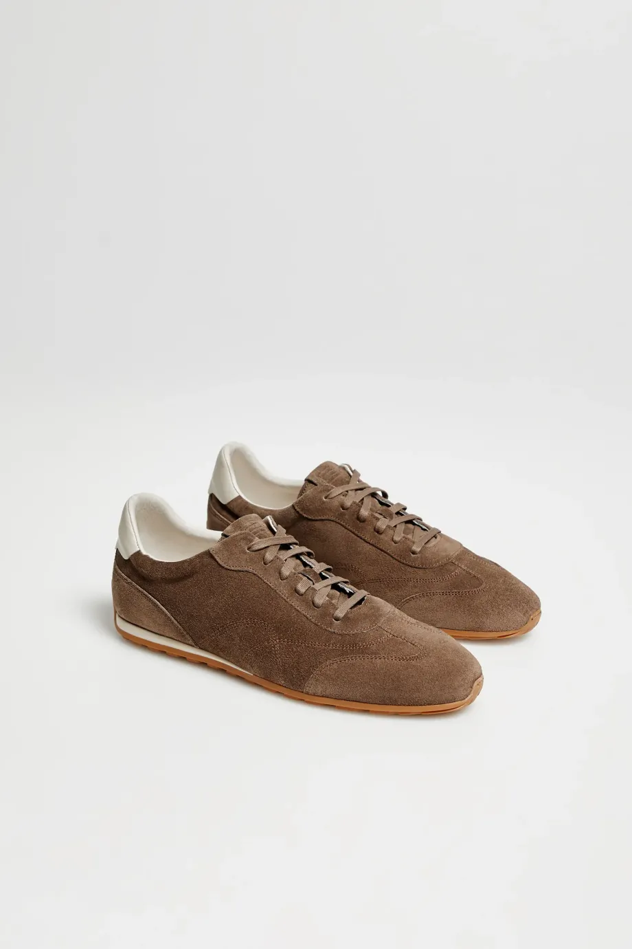 Brązowe sneakersy w stylu retro, inspirowane klasycznym obuwiem sportowym. Wykonane z naturalnej skóry zamszowej, osadzone na lekkiej, elastycznej podeszwie. Miękka wkładka. Ręcznie wyprodukowane w Polsce.