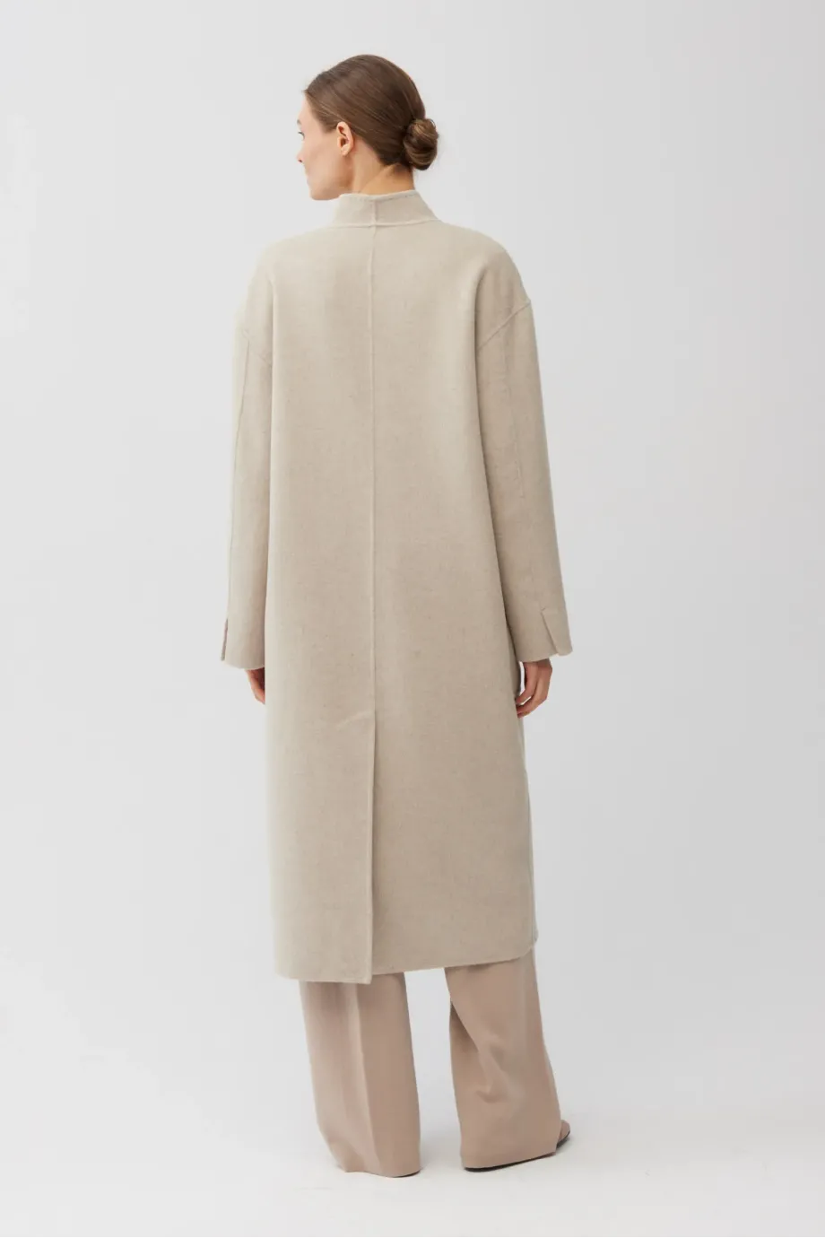 Jednorzędowy płaszcz o prostej formie, uszyty z tkaniny doubleface – mieszanki wełny i jedwabiu. Długość midi. Kołnierz typu stójka, naszywane kieszenie, rozcięcie z tyłu. Zapięcie na kontrastowe guziki. Model lekki, niepodszewkowany, wykończony ręcznie.