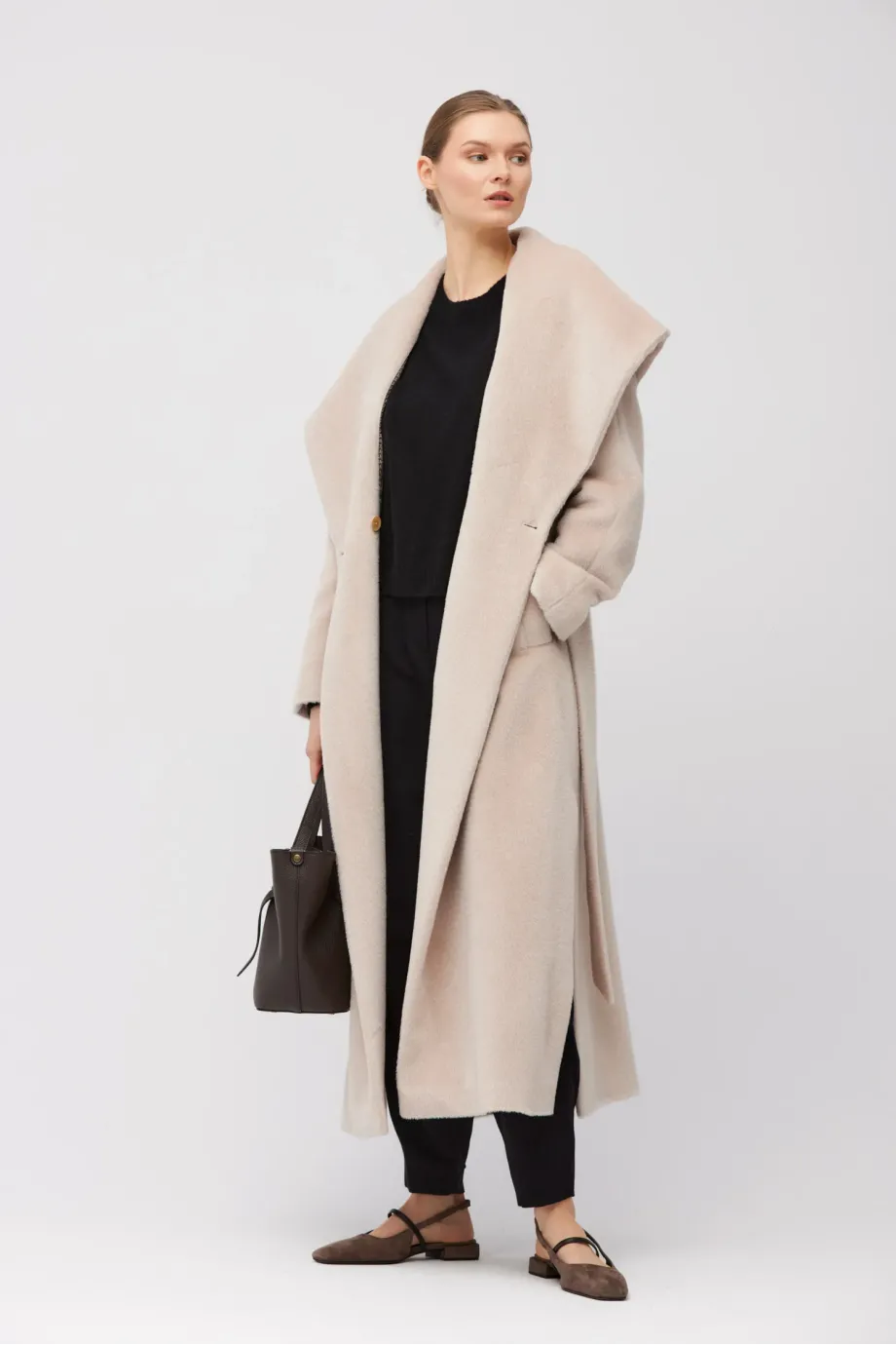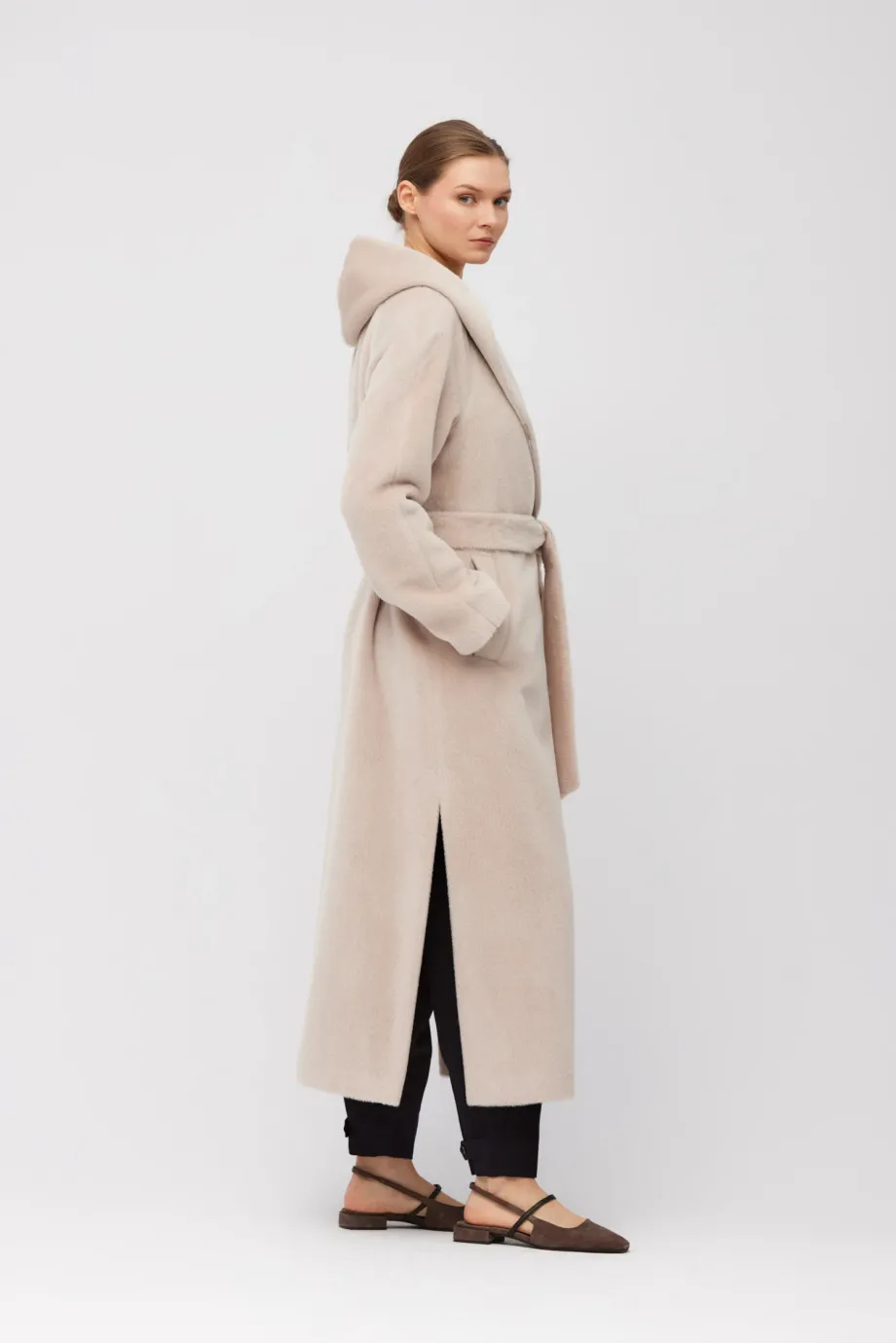 Prosta forma o długości maxi, wykonana z miękkiej tkaniny z dodatkiem baby suri alpaki. Pasek w talii, raglanowe rękawy oraz szalowy kołnierz przechodzący w kaptur. Boczne rozcięcia. Całość na podszewce z ozdobnym stebnowaniem, pipingiem i lamowaniem od środka. Zapięcie na guzik z naturalnego orzecha corozo.