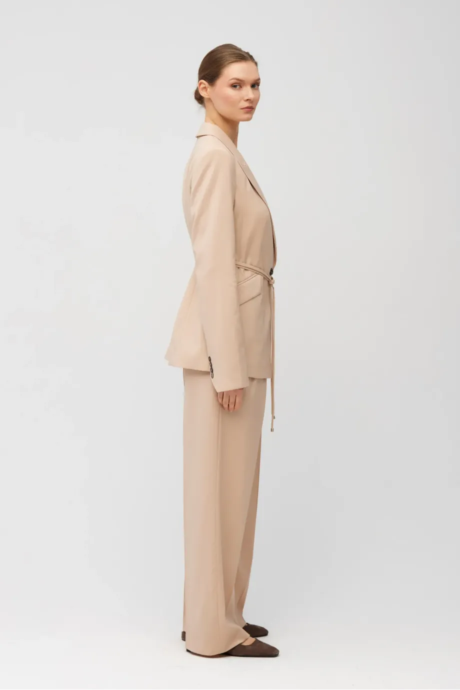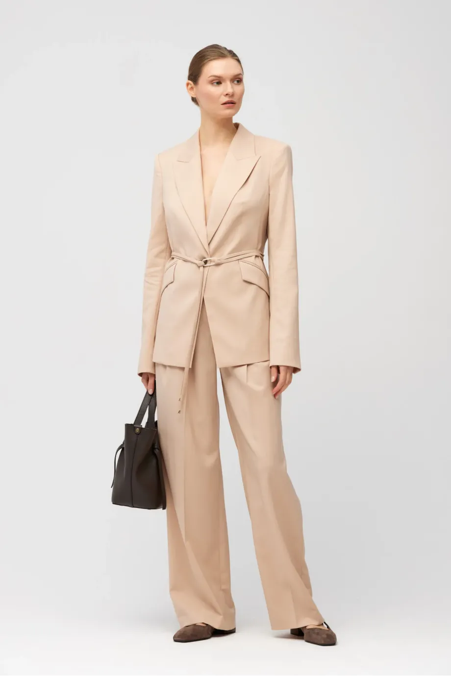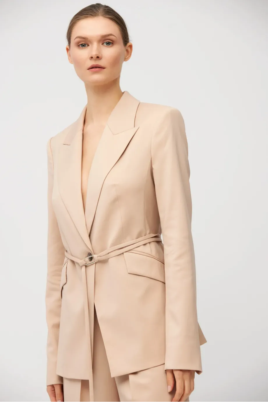 Taliowany żakiet z wełny dziewiczej w kolorze pudrowego różu. Zapięcie na jeden guzik z macicy perłowej. Delikatnie podkreślona linia ramion. Model lekko taliowany, długi rękaw, kołnierz. Kieszenie z patkami. Całość na podszewce. Do uzupełnienia zestawu spodnie z tej samej tkaniny.