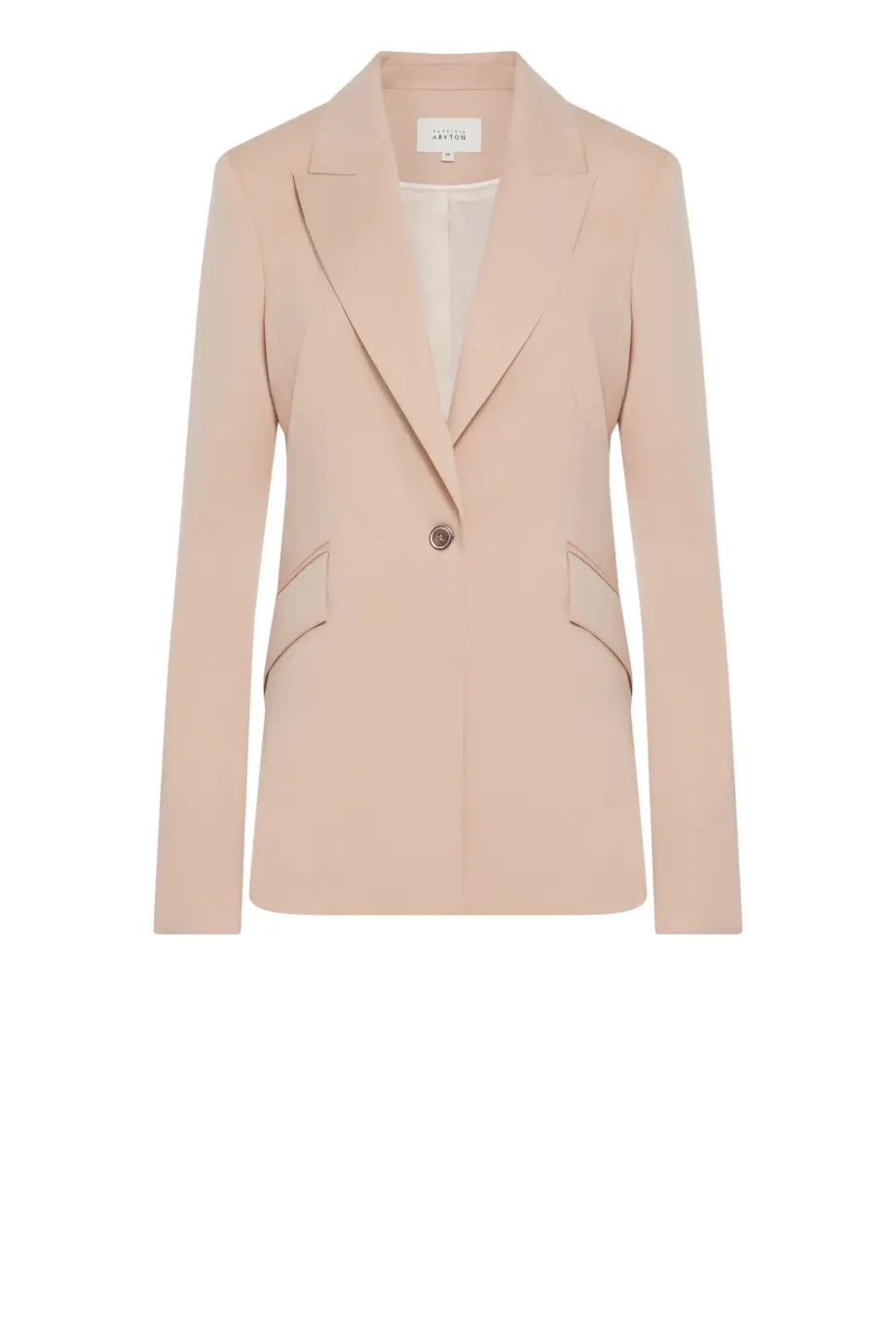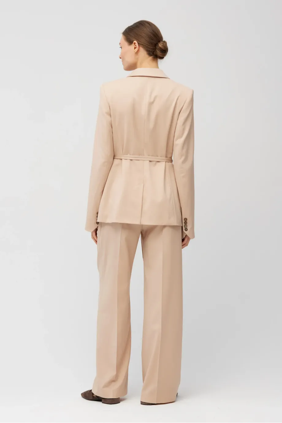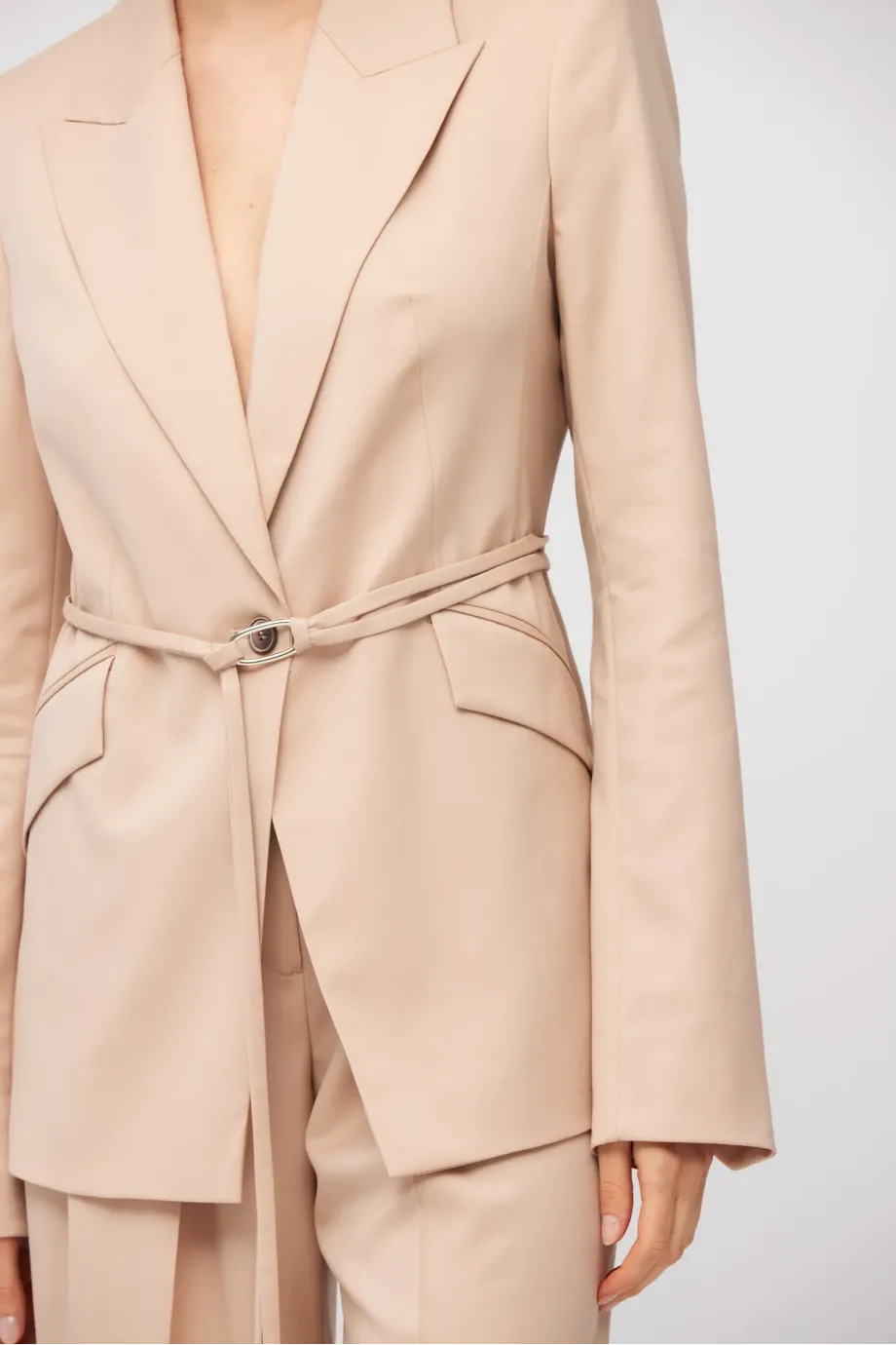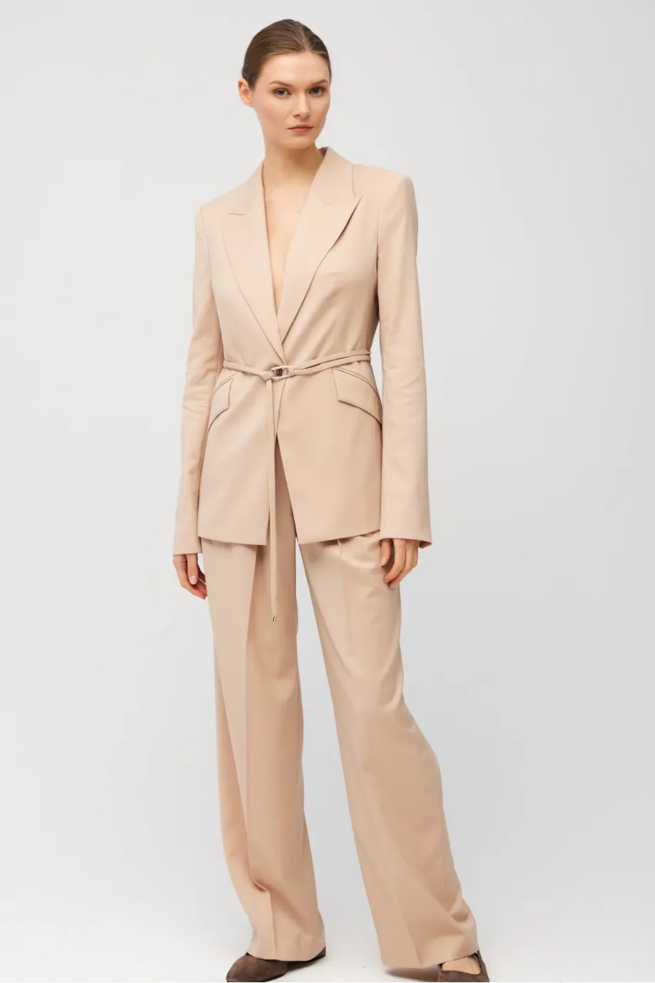 Taliowany żakiet z wełny dziewiczej w kolorze pudrowego różu. Zapięcie na jeden guzik z macicy perłowej. Delikatnie podkreślona linia ramion. Model lekko taliowany, długi rękaw, kołnierz. Kieszenie z patkami. Całość na podszewce. Do uzupełnienia zestawu spodnie z tej samej tkaniny.