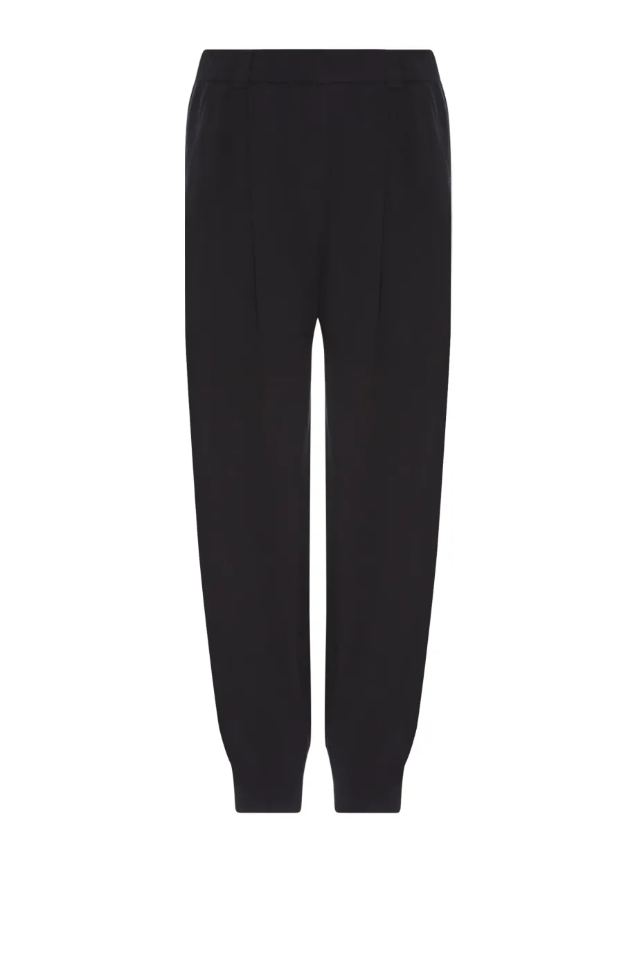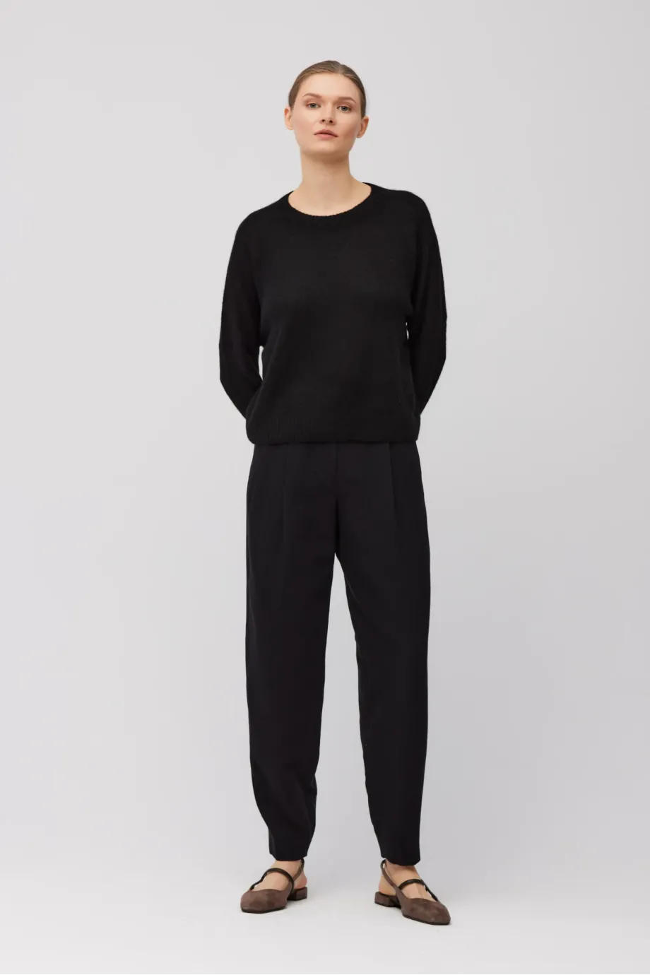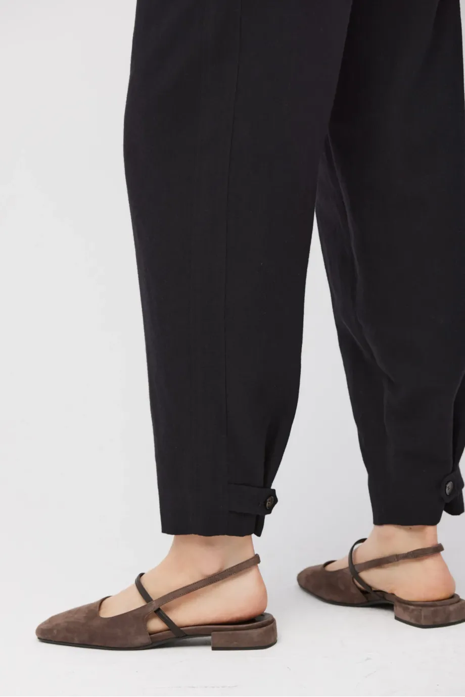 Spodnie z mieszanki wełny i lnu w kolorze czarnym. Fason z lekko zwężaną nogawką. Zakładki z przodu zapewniają lekki luz w biodrach. Elastyczna talia z tyłu. Regulacja szerokości nogawek. Boczne kieszenie. Ozdobne wykończenia wewnętrzne. Zapięcie na kryty suwak, metalowy haczyk i wewnętrzny guzik z naturalnego orzecha corozo.