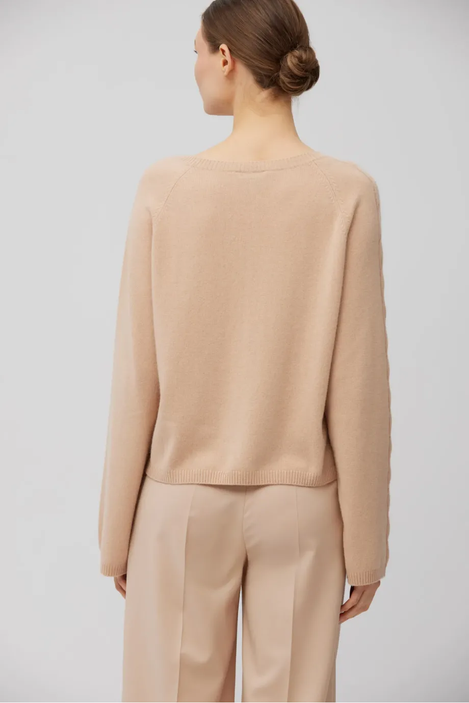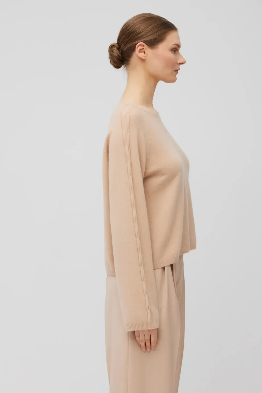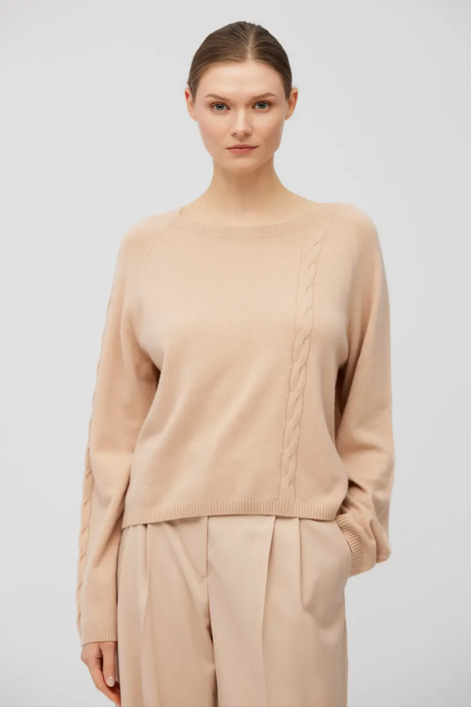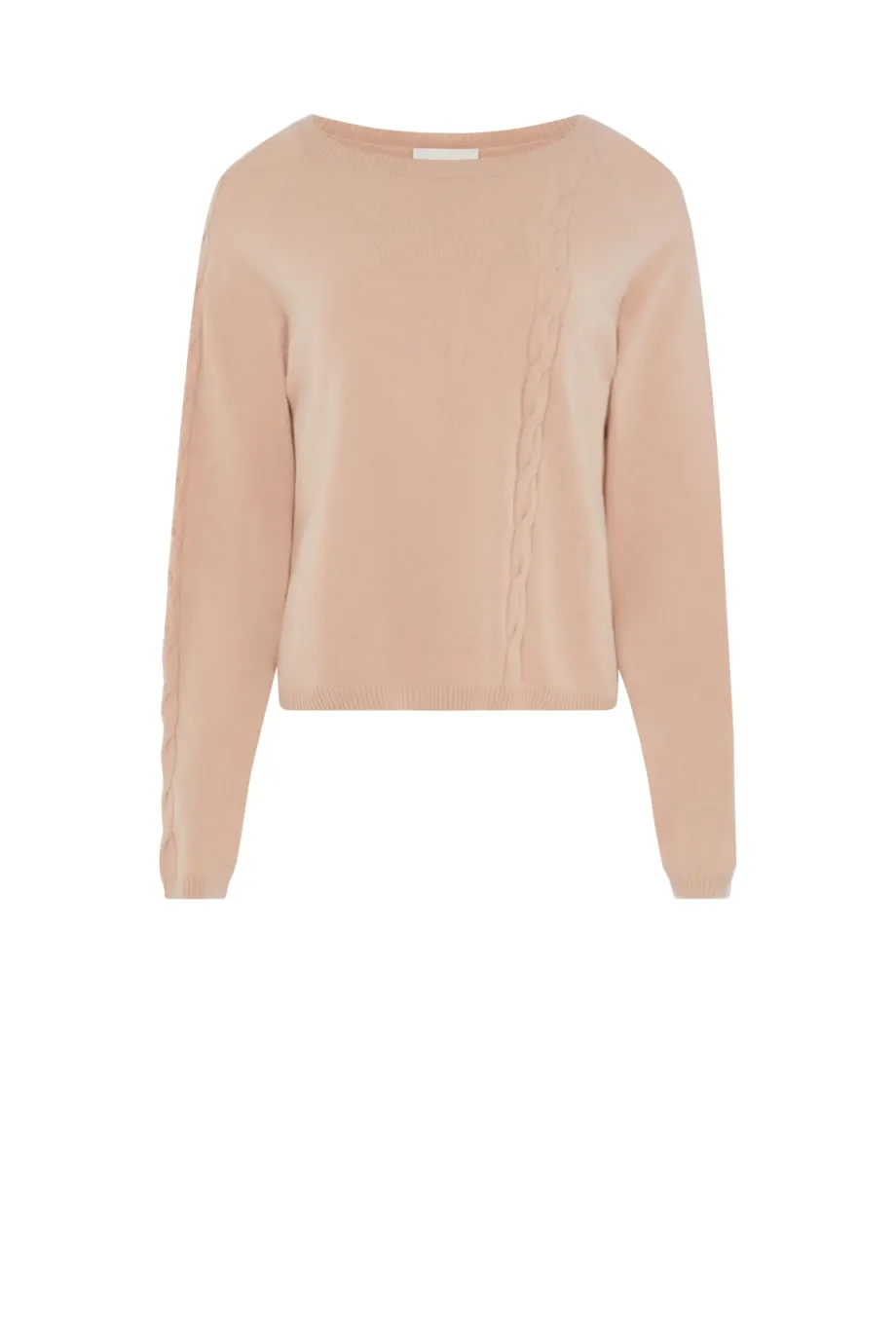 Bardzo miękka w dotyku dzianina z baby kaszmiru. Luźny fason z długim rękawem, wykonany na maszynie o uigleniu 12 GG w splocie jersey knit. Zdobienie warkoczowym splotem na przodzie i rękawach. Kolor pudrowy róż.