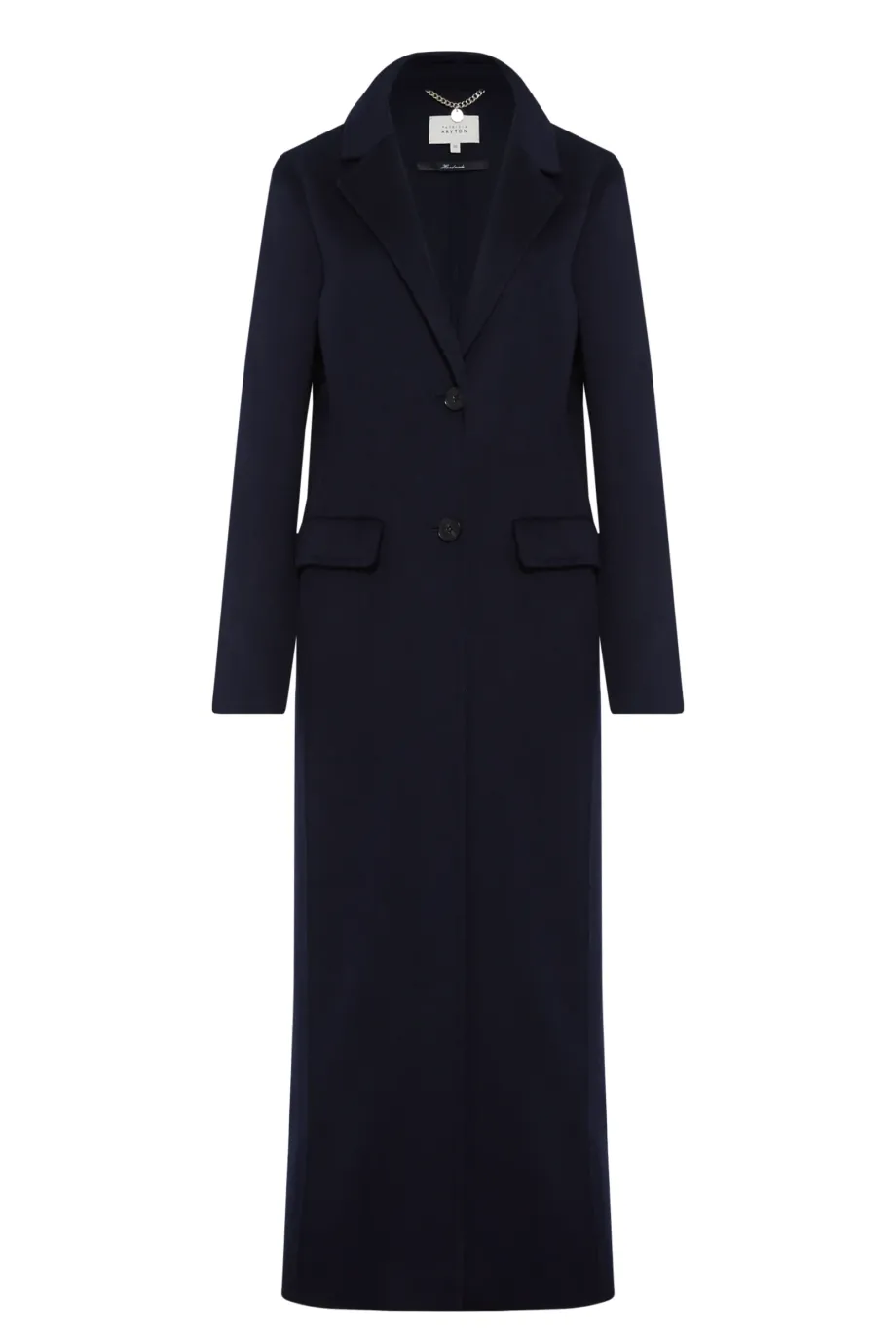 Granatowy jednorzędowy płaszcz maxi z kieszeniami