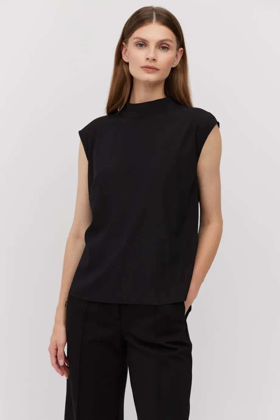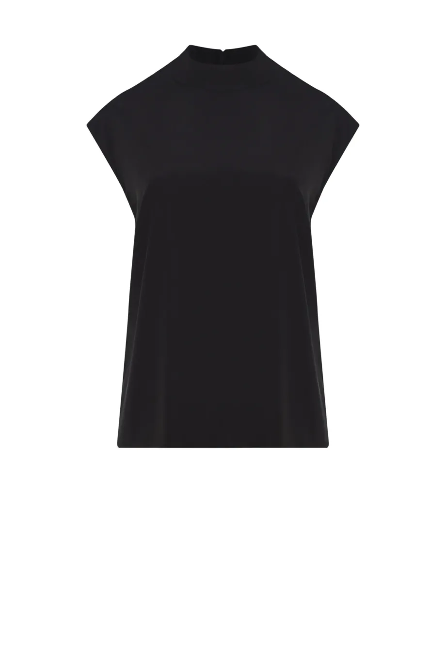Czarna bluzka z jedwabiu. Stójka, z zapięciem na szyi. Krótki, opadający rękaw. Prosty, luźny fason.