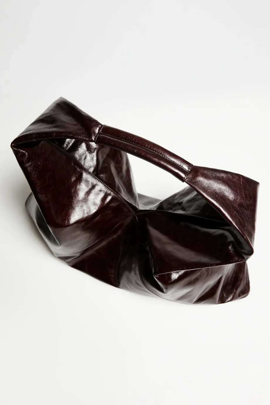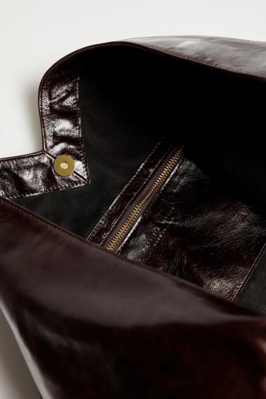 Duża torba shopper z naturalnej skóry w kolorze oberżyny. Ręcznie wykonana we włoskiej manufakturze. Wnętrze z małą kieszonką na suwak. Wygodna forma na ramię.
