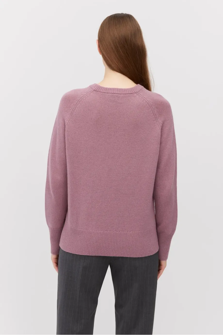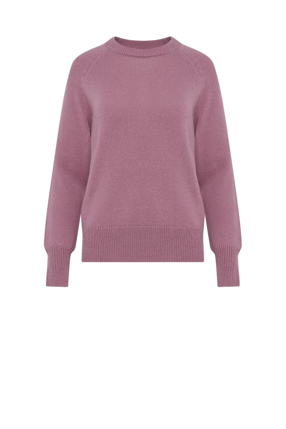 Sweter z mieszanki wełny merynosowej i kaszmiru, o prostym kroju i luźnym fasonie. Wykonany w splocie single jersey, z okrągłym dekoltem i długimi rękawami. Kolor fioletowy.