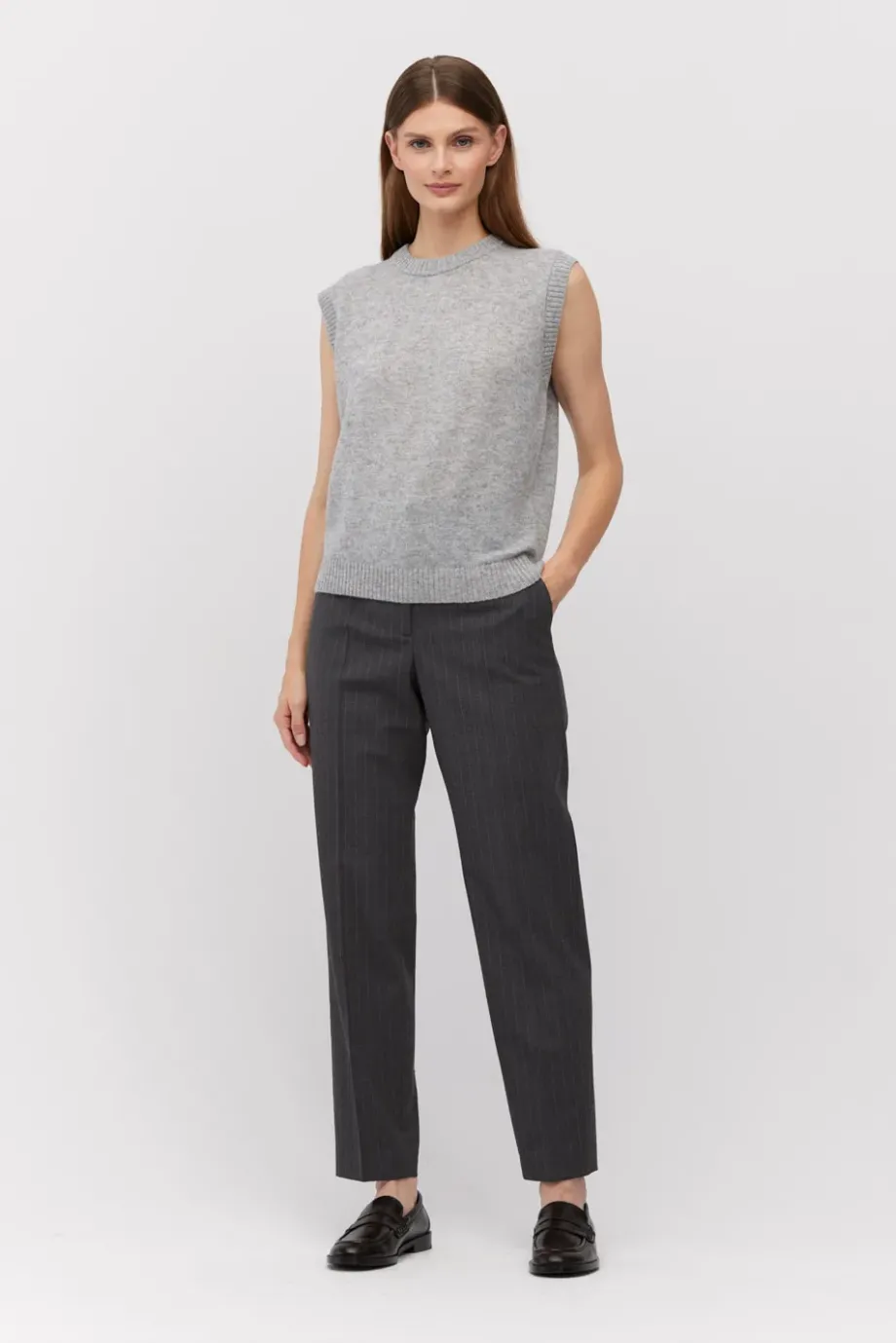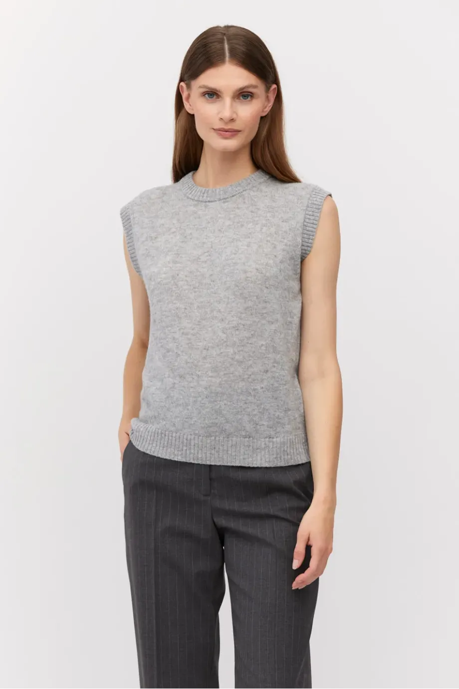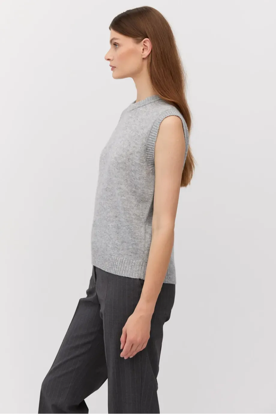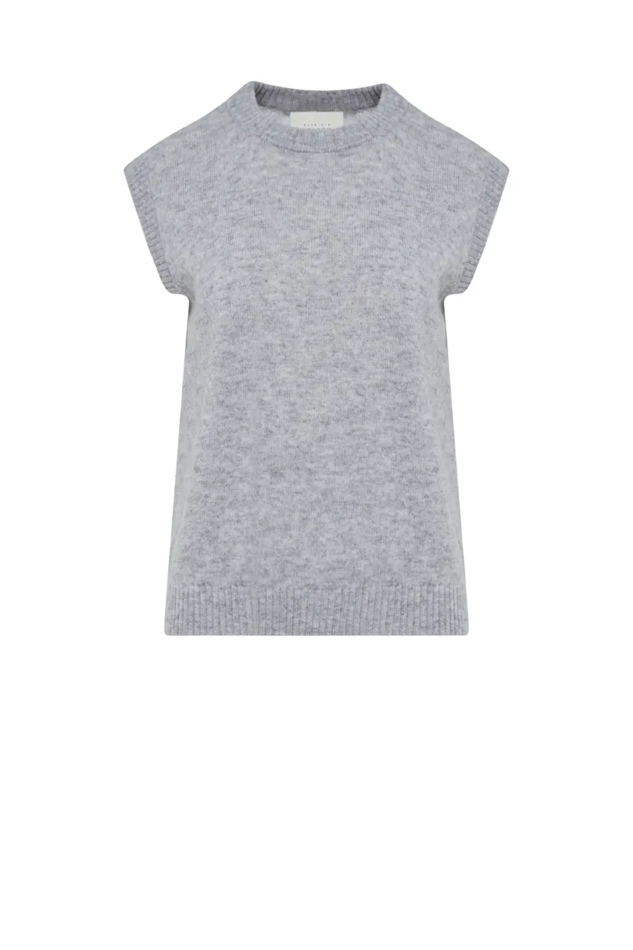 Szary sweter z wełny merynosowej i kaszmiru, o prostym kroju i luźnym fasonie. Krótki rękaw, okrągły dekolt, splot single jersey przygotowany na maszynie o uigleniu 7 GG.