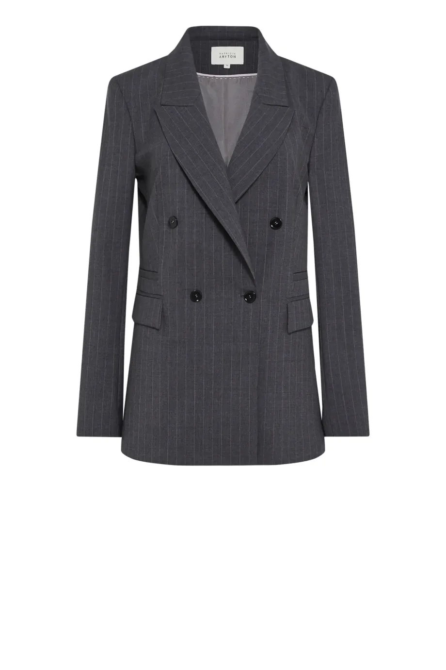 Żakiet dwurzędowy w paski, uszyty z wełny jagnięcej w kolorze ciemnej szarości. Delikatnie taliowany fason, długi rękaw, zapięcie na guzik z macicy perłowej oraz wewnętrzny guzik z orzecha corozo. Kieszenie. Model na podszewce, z ozdobnym stebnowaniem i pipingiem od środka.