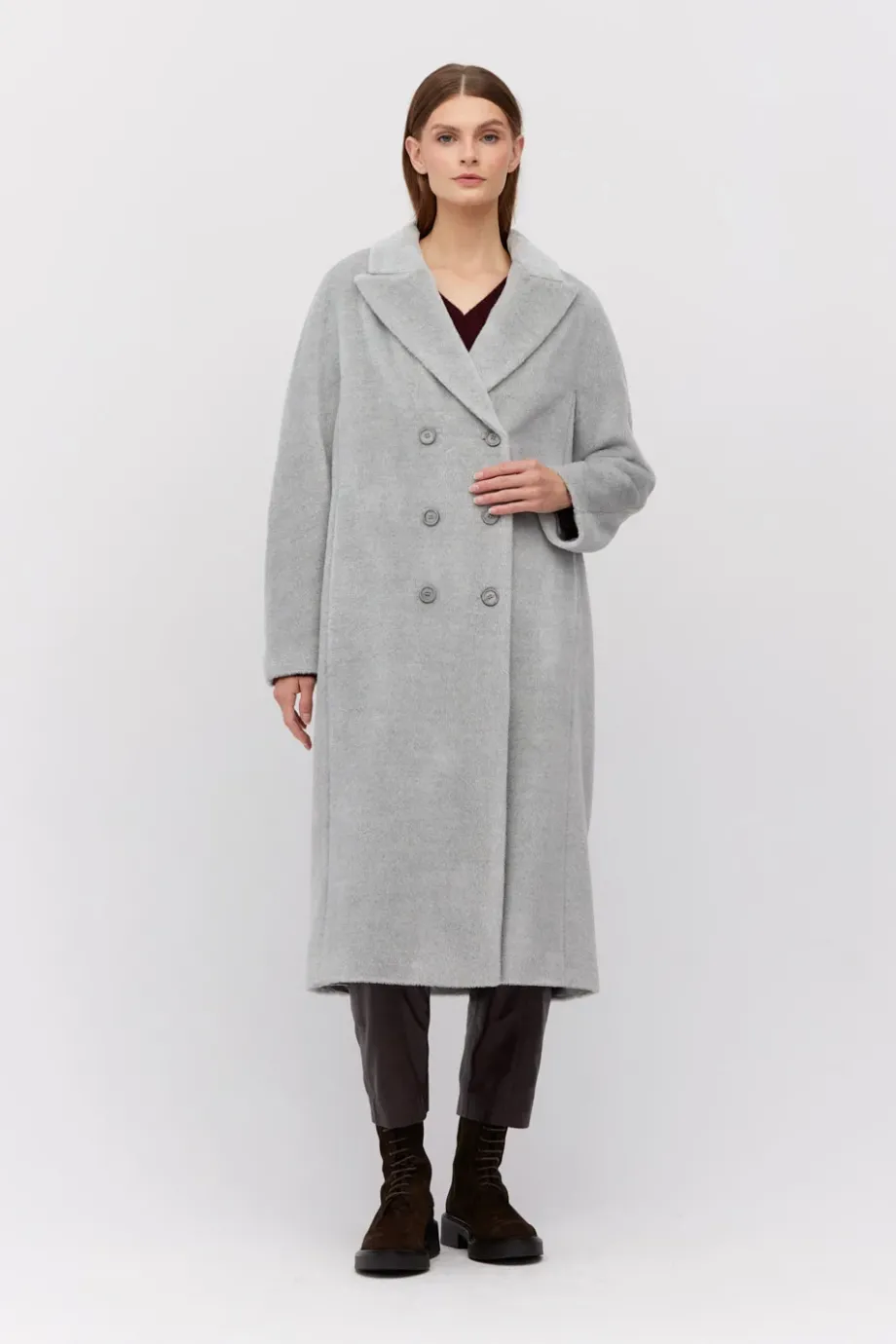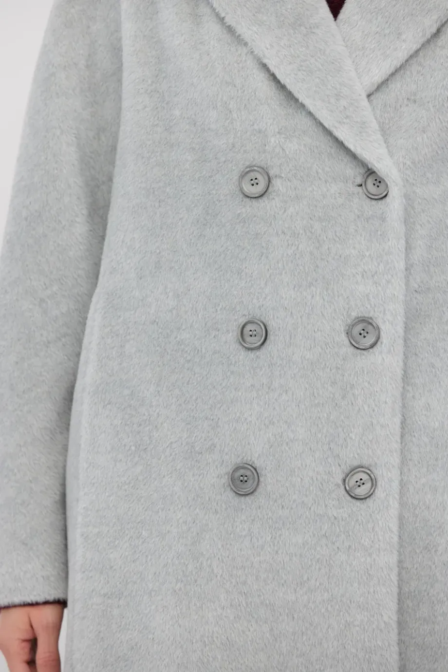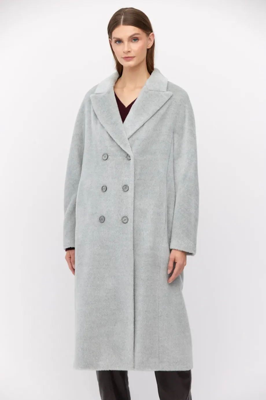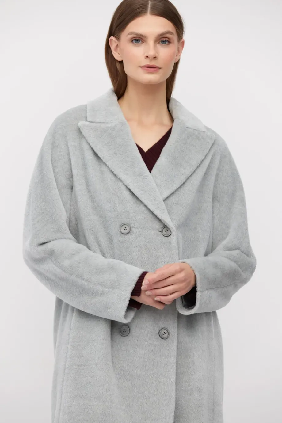 Płaszcz w odcieniu szarości z baby suri alpaką. Luźna, prosta forma, dwurzędowe zapięcie na naturalne guziki. Rękaw kimono, z tyłu rozcięcie. Model na podszewce wykończonej ozdobnym pipingiem.
