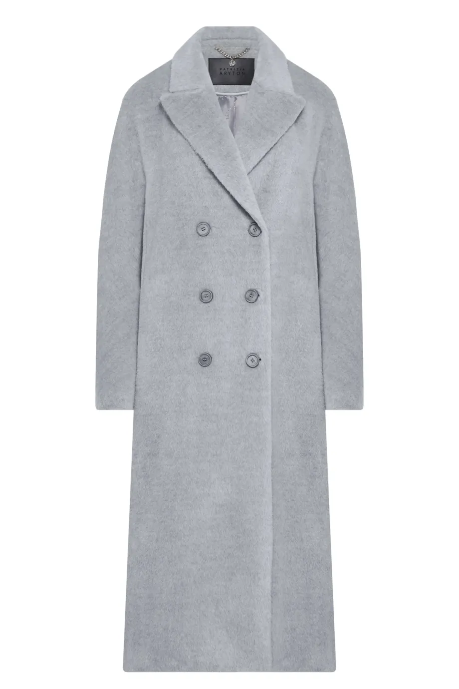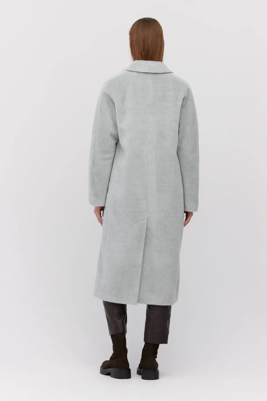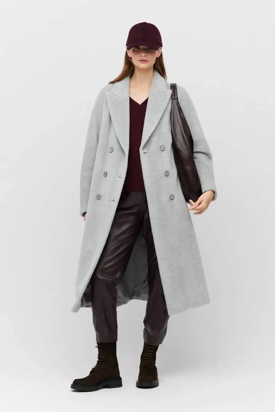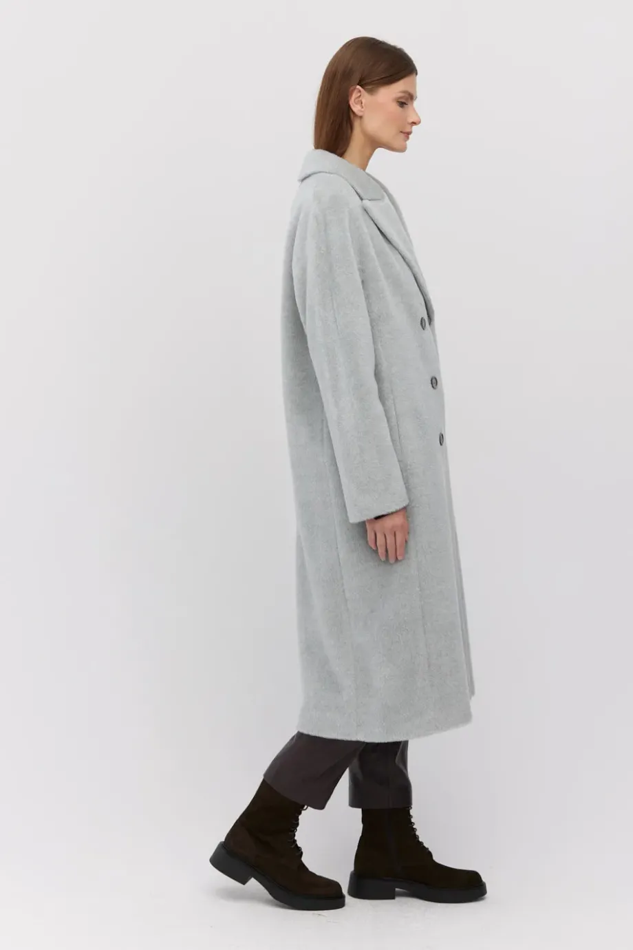 Płaszcz w odcieniu szarości z baby suri alpaką. Luźna, prosta forma, dwurzędowe zapięcie na naturalne guziki. Rękaw kimono, z tyłu rozcięcie. Model na podszewce wykończonej ozdobnym pipingiem.