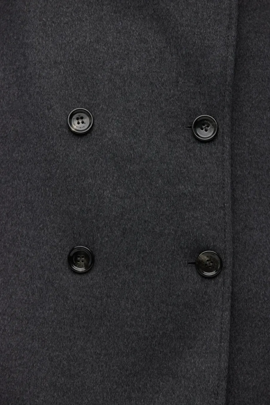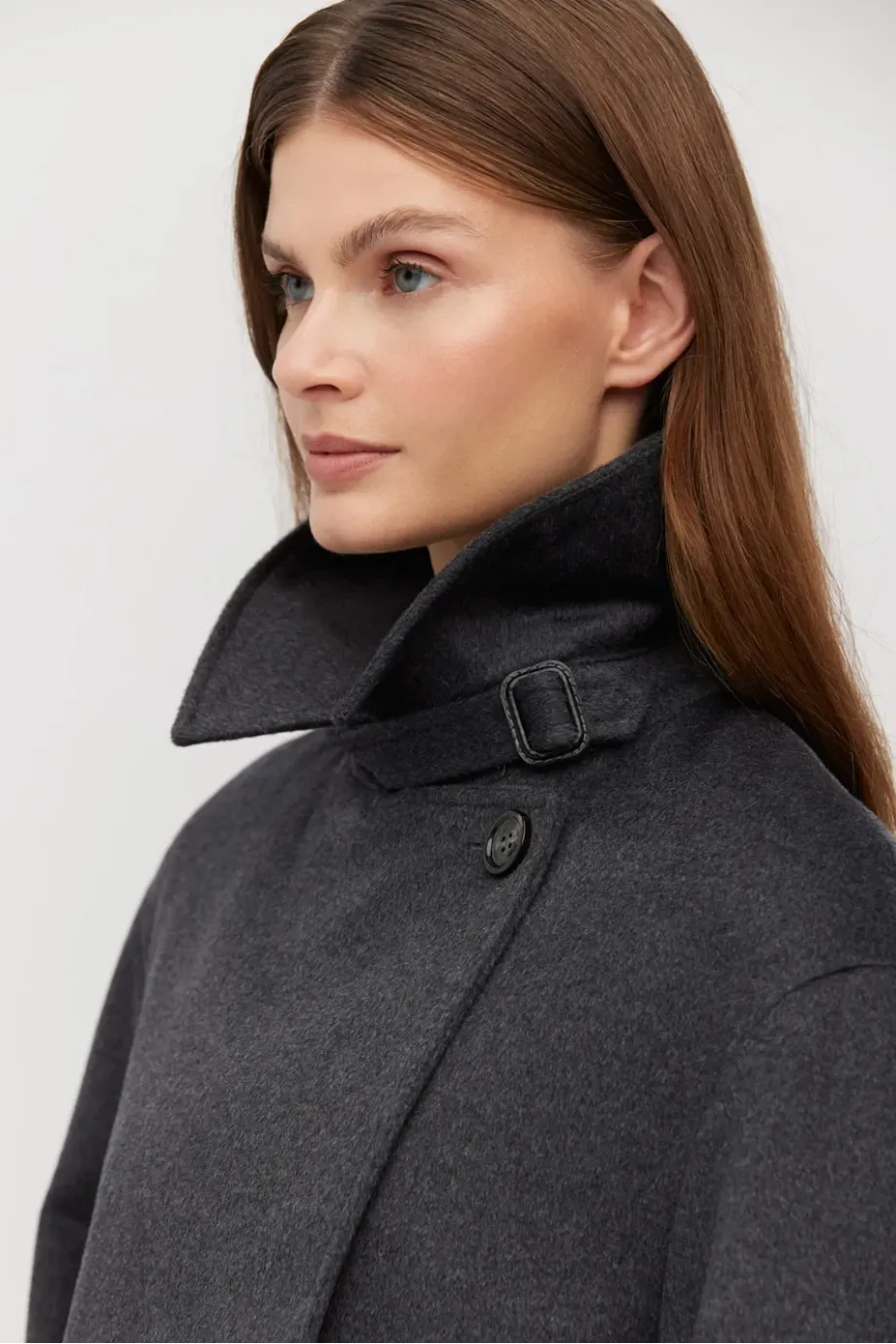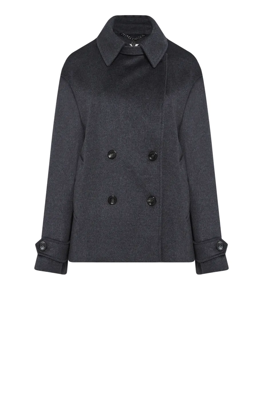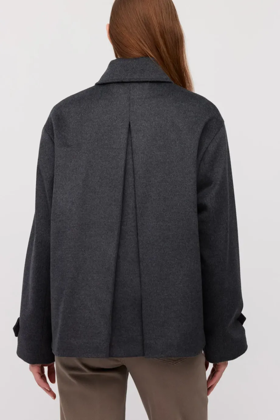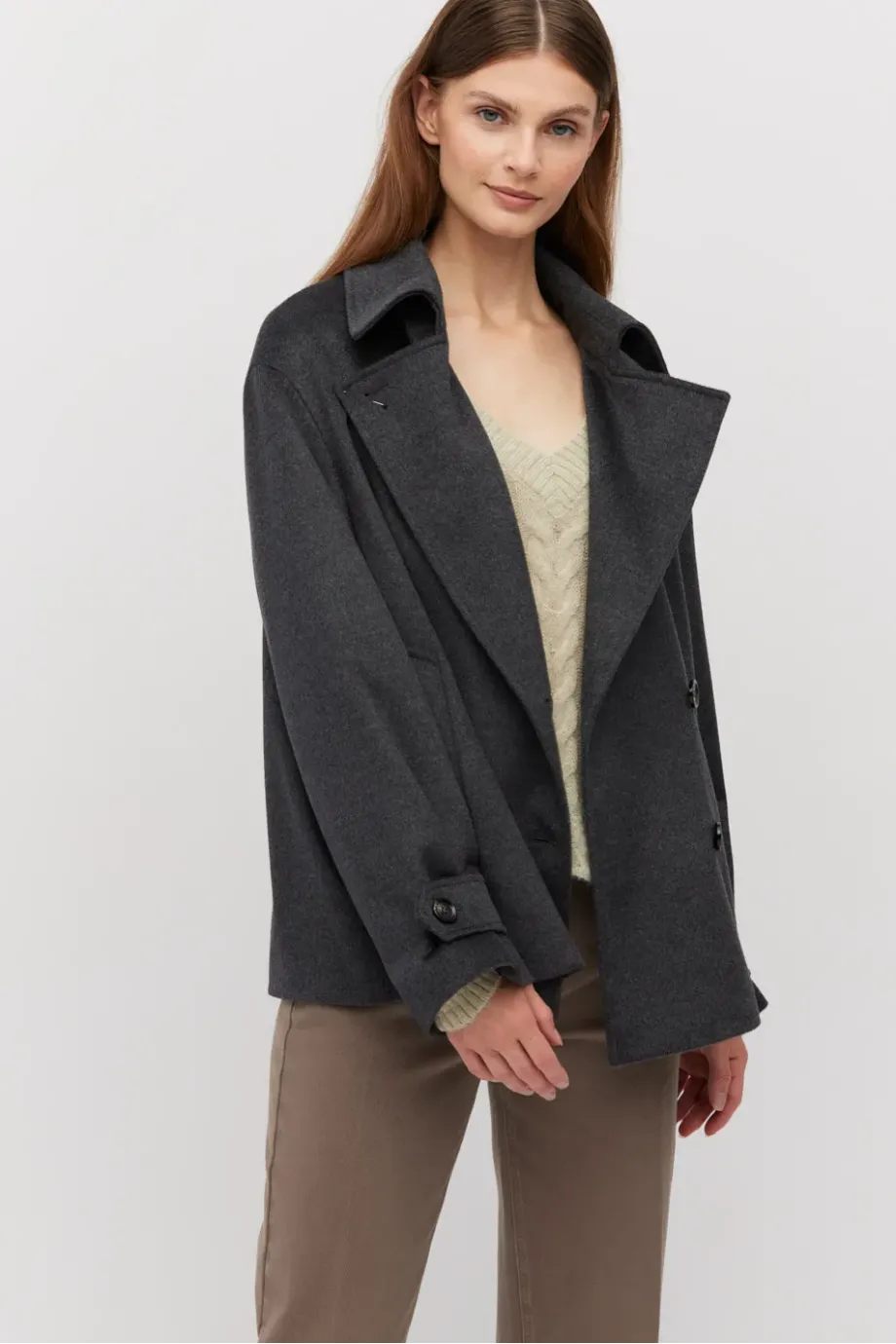 Ciemnoszara kurtka z wełny o luźnym fasonie. Dwurzędowa, zapinana pod szyją. Model z podszewką, lekko opadającymi ramionami, kontrafałdą z tyłu i pagonami na rękawach.