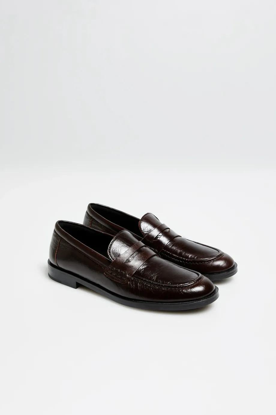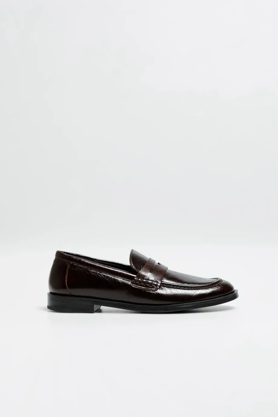 Sukienka midi w kolorze ciemnego brązu, o prostym, luźnym fasonie z krótkim, opadającym rękawem i delikatną stójką. Wykonana z wełny, ściegiem link links na maszynie o uigleniu 15 GG. Minimalistyczna.